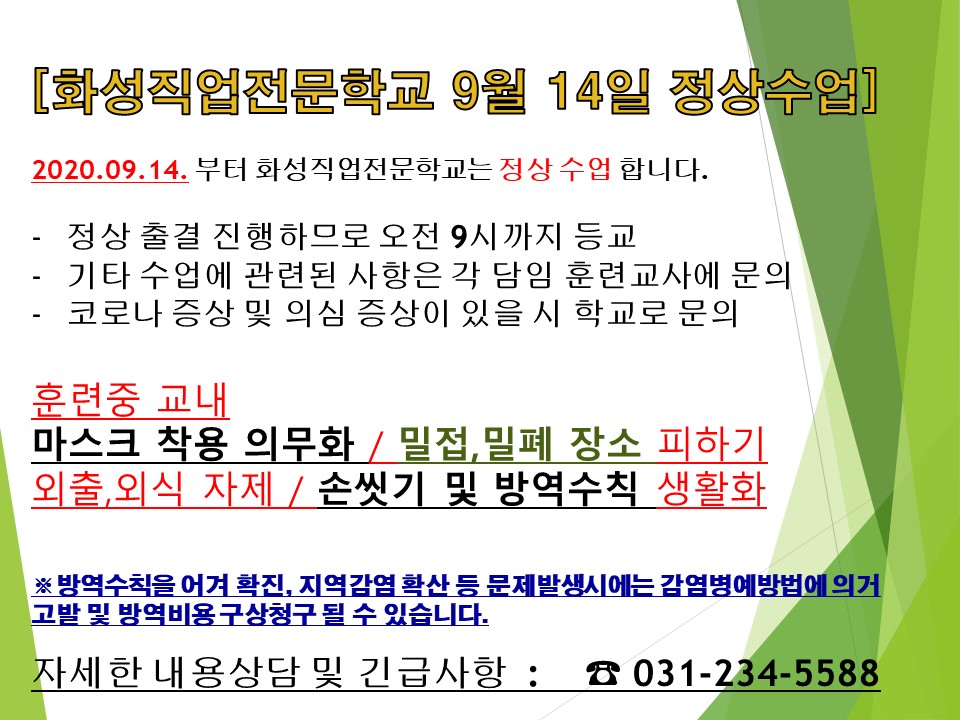 화성직업전문학교 9월 14일 정상수업 공지