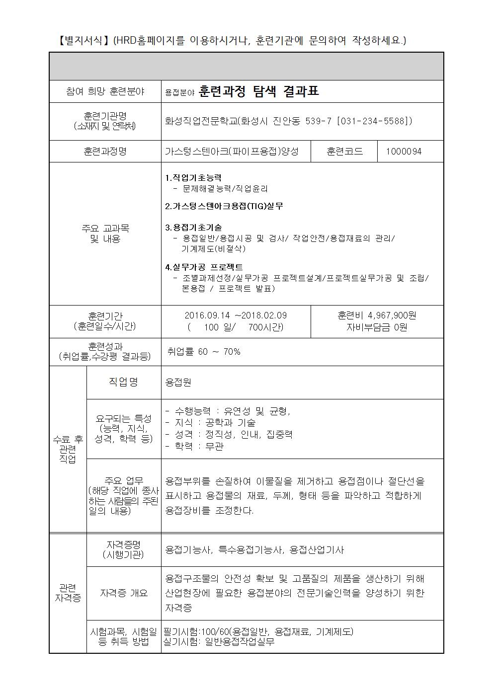 가스텅스텐아크(파이프용접)양성 훈련 탐색 결과표